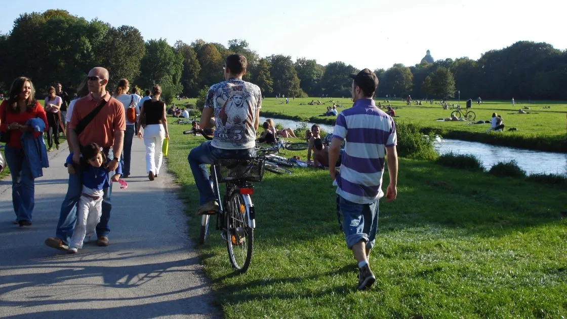 ინგლისური ბაღის ფართობი 4 კმ²-ზე მეტია. იგი საზოგადოებისთვის 1790 წელს გაიხსნა და მას შემდეგ ადგილობრივ მოსახლეობაში პოპულარობით სარგებლობს როგორც ადგილი, სადაც დასვენება, ფეხით გასეირნება და სპორტით დაკავებაა შესაძლებელი. აქ შეგიძლიათ ველოსიპედით გაისეირნოთ, იხვები და სხვა ცხოველები გამოკვებოთ, მდინარეში იბანაოთ და გაირუჯოთ (მათ შორის წელს ზემოთ შიშველი), მხიარულად გაატაროთ დრო ჩინურ კოშთან ახლომდებარე ლუდის ბაღში (რომელიც 7000 ადამიანზეა გათვლილი და ზომით მეორეა მიუნხენში), დატკბეთ ქალაქის ხედით გორაკიდან, სადაც როტონდა მონოპტერი მდებარეობს და ექსტრემალებს ადევნოთ თვალყური, რომლებიც წელიწადის ნებისმიერ დროს სერფინგით არიან დაკავებული აისბახის წყლებში - პარკის ყველაზე ღრმა მდინარეში.